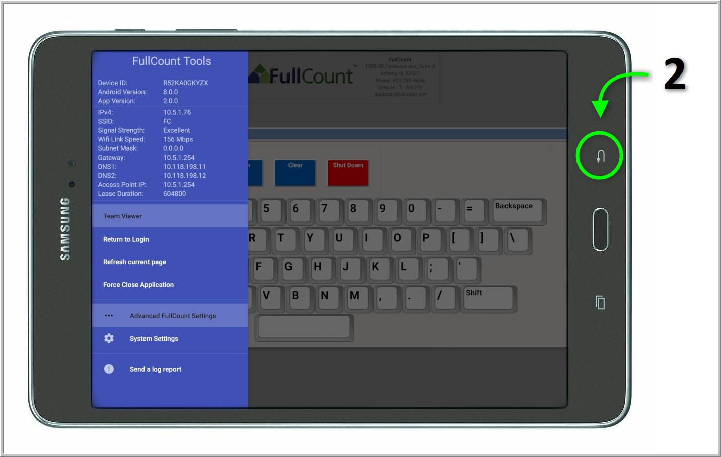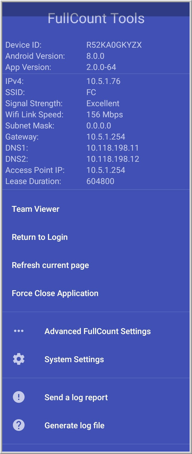 - Force Close Application: Selecting the Force Close Application feature with shut down the FullCount app from any page and return you to the tablet Home Page.