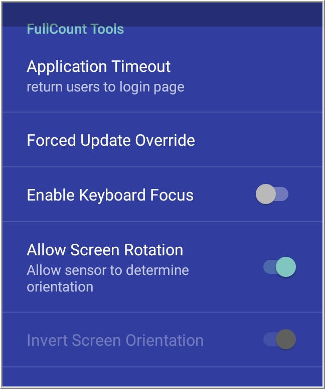 - Invert Screen Orientation: On Samsung Tab A models, the FullCount application does not feature automatic screen rotation. The Invert Screen Orientation feature allows you to rotate the application 180o,