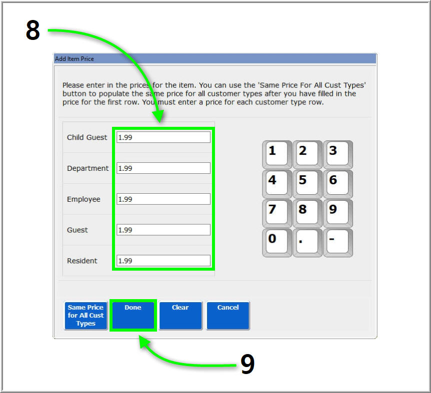 *NOTE: If all prices will be the same, enter the first price field, then press the Same Price for All Cust Types button.