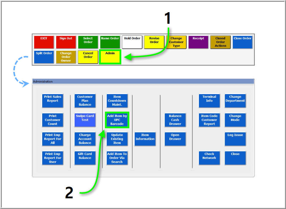 - On the Administration screen, press the Add Item by UPC Barcode button.