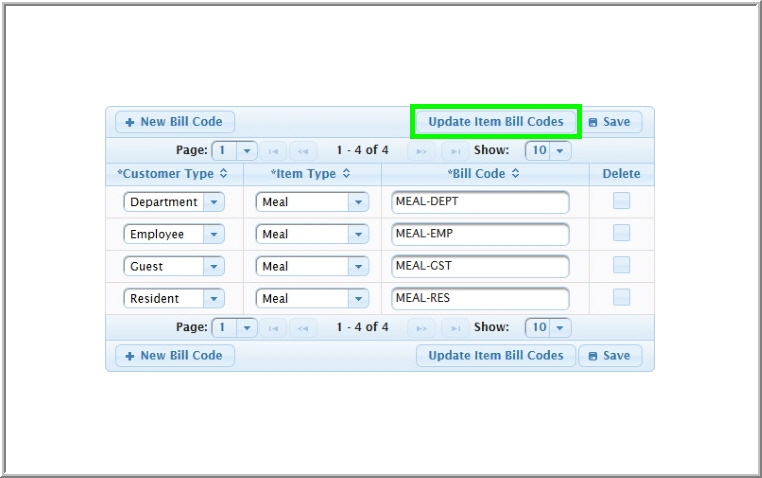 The Update Item Bill Codes button will search for items in your system with empty bill code fields and fill in the corresponding code. If an empty customer type field has no assigned bill code, the system will leave that field blank.
