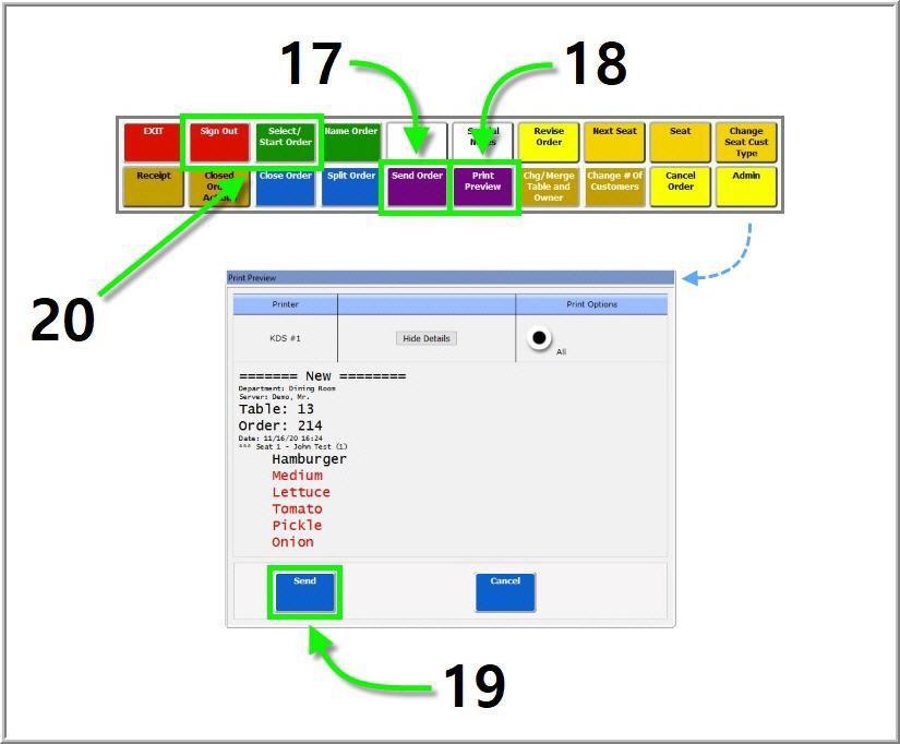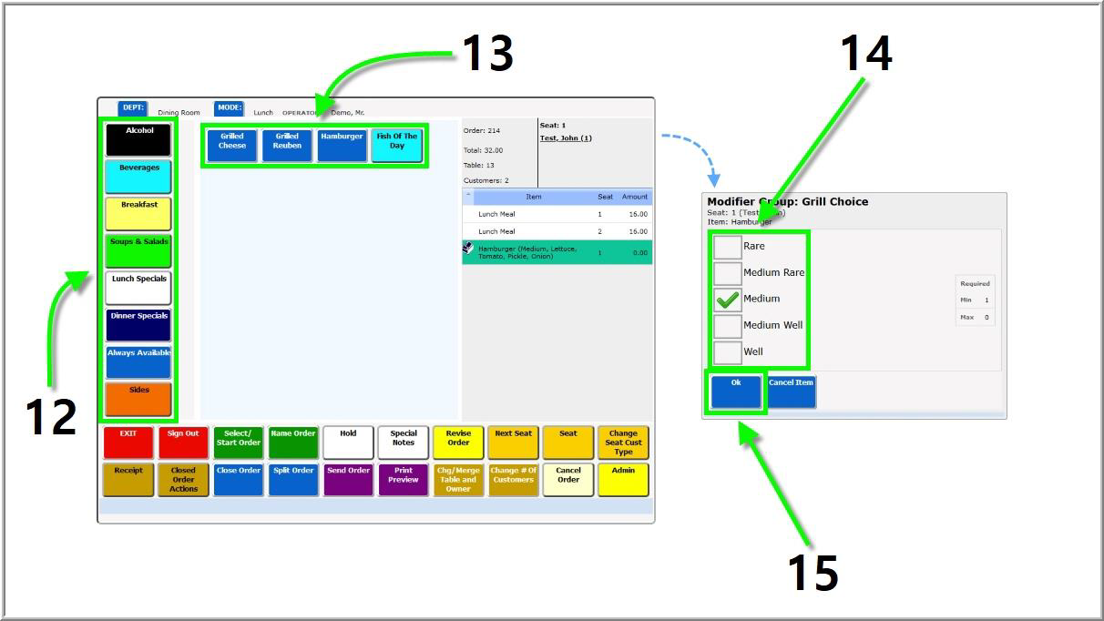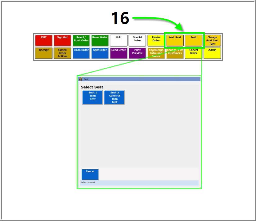 *NOTE: New orders always begin on Seat 1. Added items will default to the first customer until the user switches to another seat. (See step 16 below.)