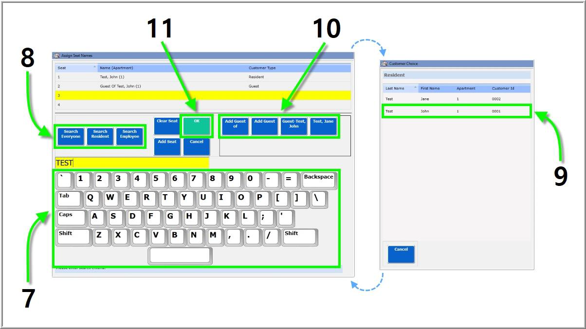 - Enter a customer’s name or apartment number using the virtual keyboard.