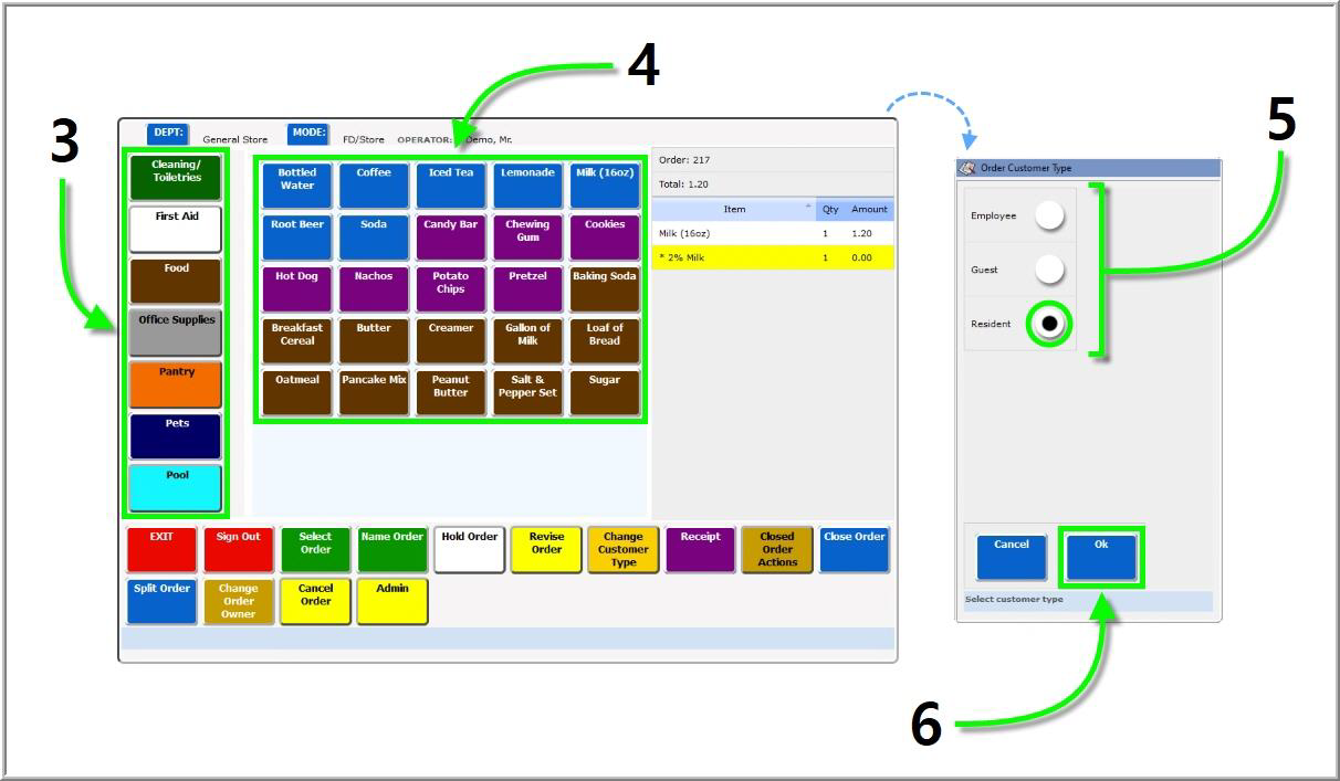 The steps below walk through an order in store mode, start to finish. An order, however, is not required to be closed immediately. Before starting an order, a user must sign in to the department following the steps below: