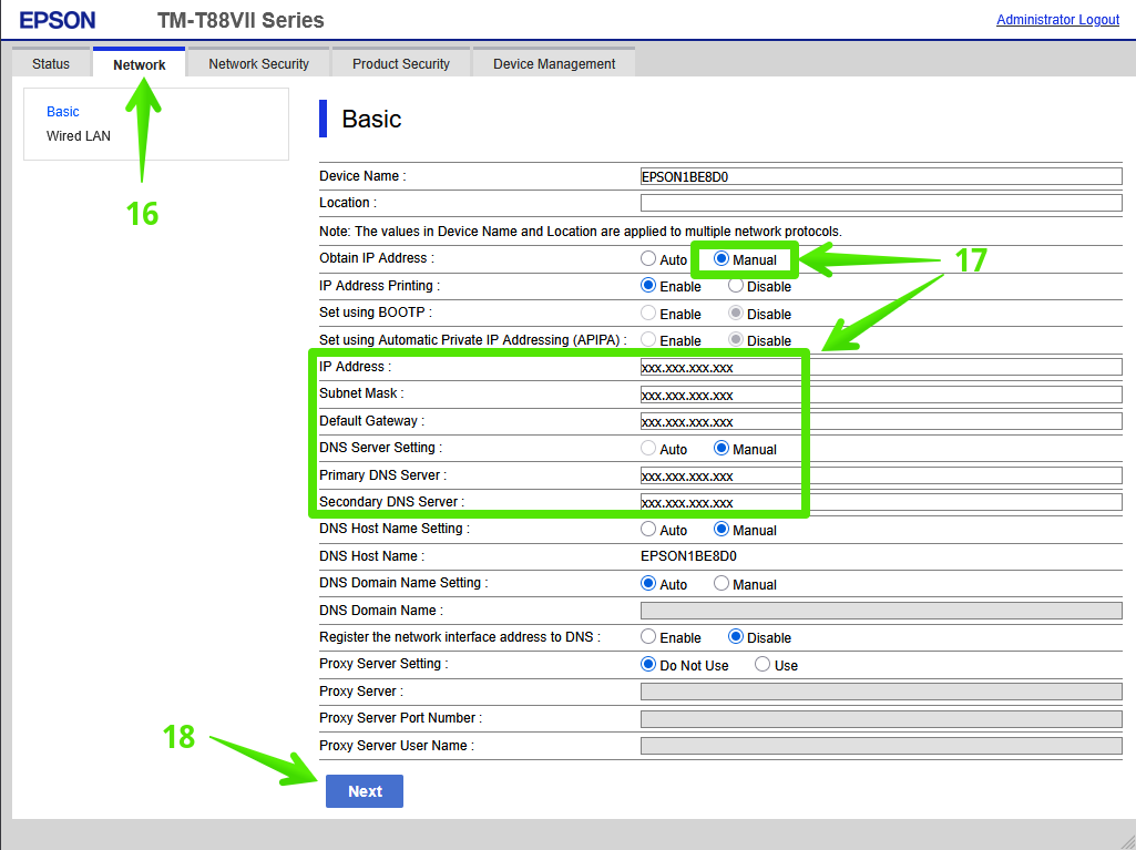 - Enter the following settings to set a static IP address for the printer: