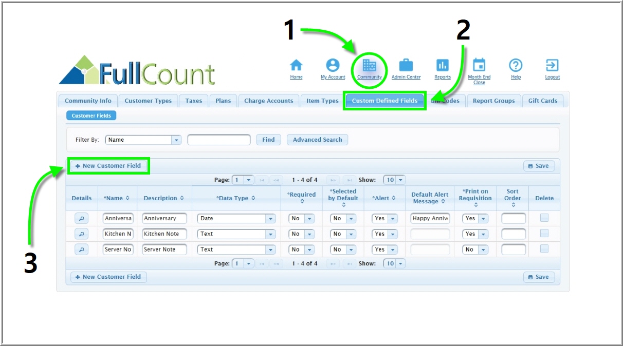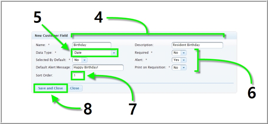 - Default Alert Message – [For Date data types only] Add text that will appear to the server when the assigned customer is added to an order on the field’s date.