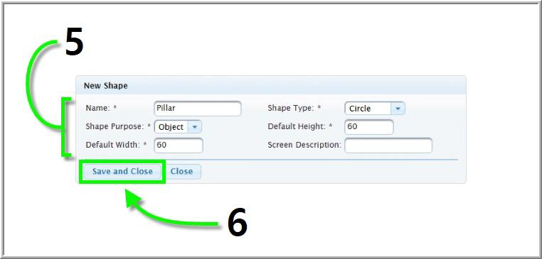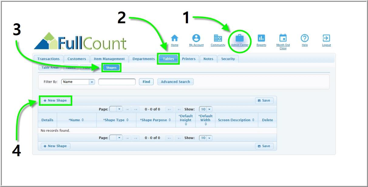 Non-Table Shapes can be used to fill out and clarify a floor plan. New non-table shapes are created in the FullCount Back Office then added to a floor plan on the Touchscreen. To create a non-table shape, follow the steps below: