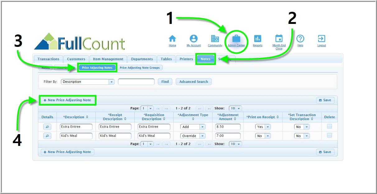 the FullCount Back Office but used from the Special Notes section of the Touchscreen. To create a new price adjusting note, follow the steps below: