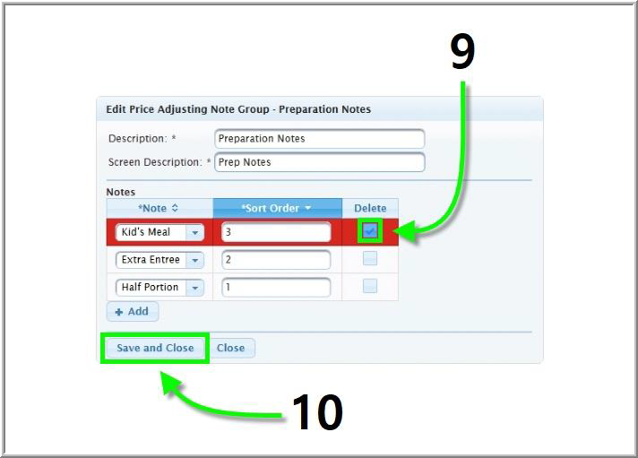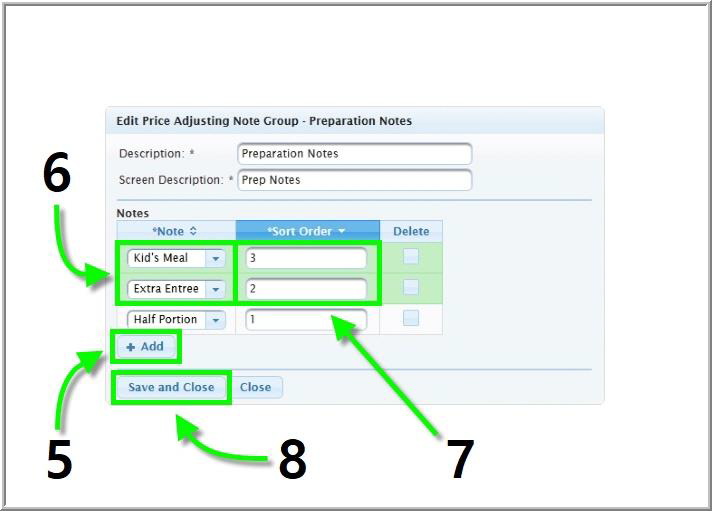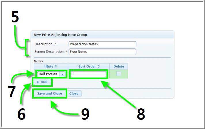 Price Adjusting Note Groups hold and organize price adjusting notes, which alter the price of an item. When a newly created price adjusting note is added to price adjusting note group from the Back Office, it will be available to use from the Special Notes section of the Touchscreen.