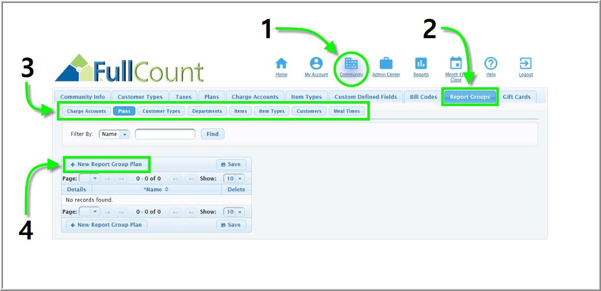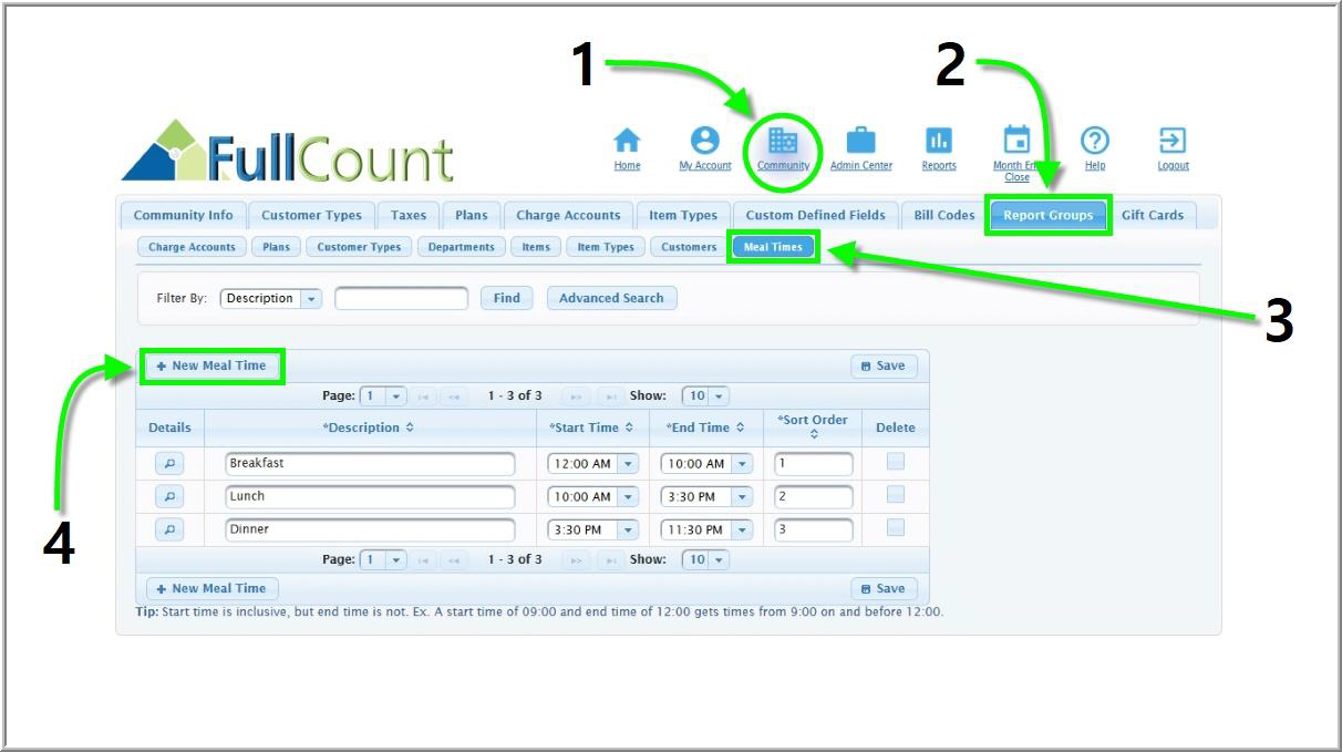 The Report Groups tab also houses information on community meal times. Certain reports will only run if these times have been set in the Back Office. Meal times apply to the community at large and cannot be set for individual departments. To set up meal times for you community, follow the steps below: