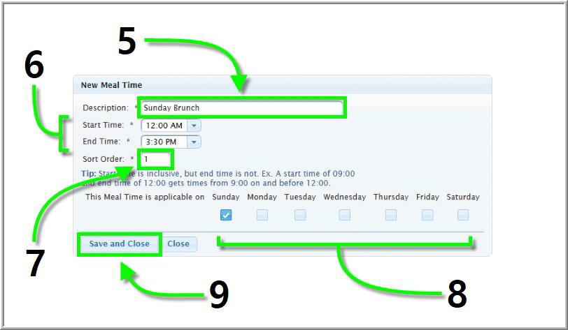 *NOTE: Any transaction that is not closed within a specific meal time will not appear on Meal Time Summary reports. For this reason, you may choose to extend the beginnings and ends of meal times to cover all daily hours. (See the Breakfast, Lunch, and Dinner examples above.)