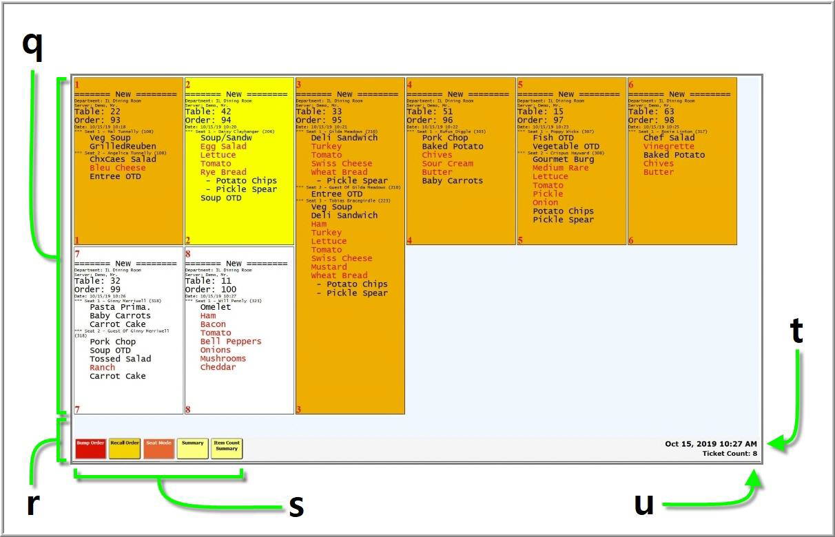 troubleshooting. A date & time stamp (t) can be found in the lower right corner of the screen above the ticket count. The ticket count (u) shows the total number of sent requisitions, including queued tickets that cannot yet fit on the display monitor.