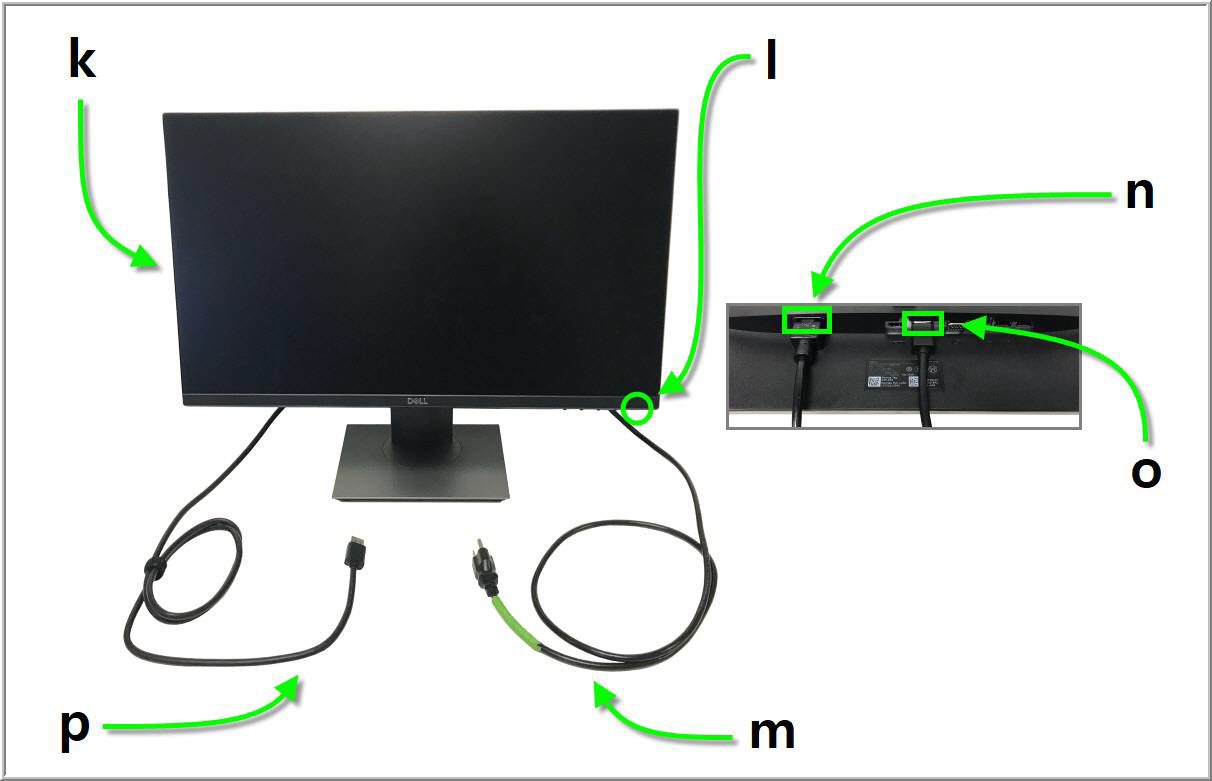 The monitor power cord (m) requires a grounded outlet and connects to the monitor power port (n) on the back of the device. Left of the power port, the monitor display port (o) connects to the CPU through the display cord (p).