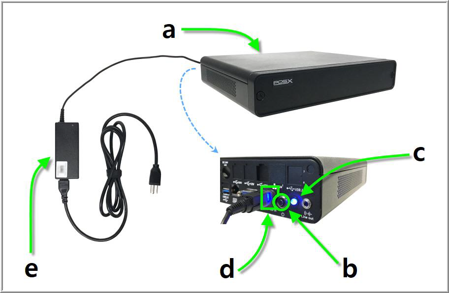 The Kitchen Display CPU (a) runs the system software. The back of the unit holds several ports needed to power and support the Kitchen Display System. The CPU power button (b) is on the far right next to the LED power light (c). This blue indicator will stay illuminated while the device is on. Left of the power button is the CPU power port (d), which powers the device through the CPU power cord (e).