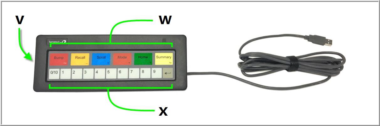 through a direct USB connection. The bump bar has a top row of six function buttons (w) and a bottom row of ten number keys (x). These buttons and their functions are described below: