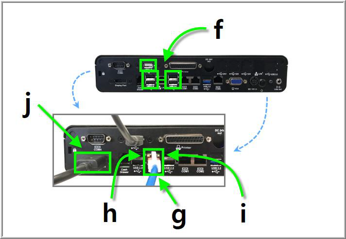 Any of the USB ports (f) can be used to connect the bump bar. The other USB ports may be needed for a keyboard or flash drive when working with FullCount support. The Ethernet port (g) is located between the USB ports with the label LAN which stands for local area network. The solid orange activity light (h) on the left indicates that the terminal is turned on and processing data. The green link light (i) on the right blinks to indicate that the unit is connected to a network.