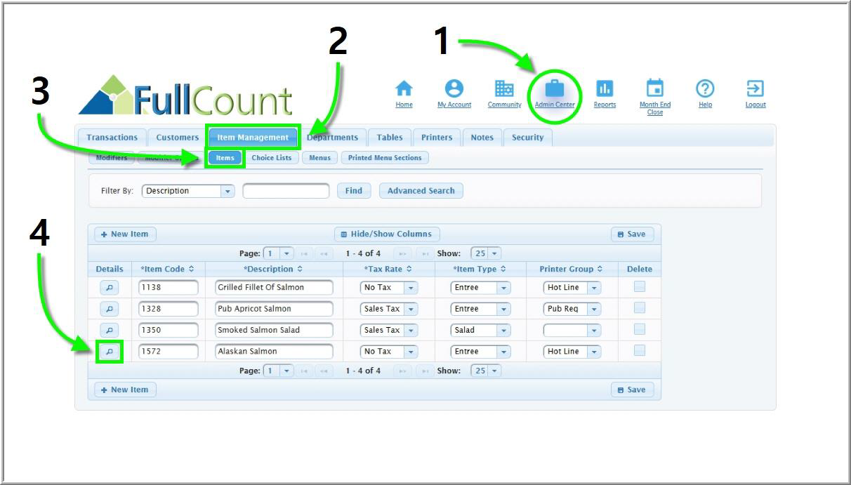 Item prices are most often changed from the FullCount Back Office. To change an item’s price from the Back Office, follow the steps below: Select the Admin Center button. Select the Item Management tab. If it is not selected by default, choose the ...
